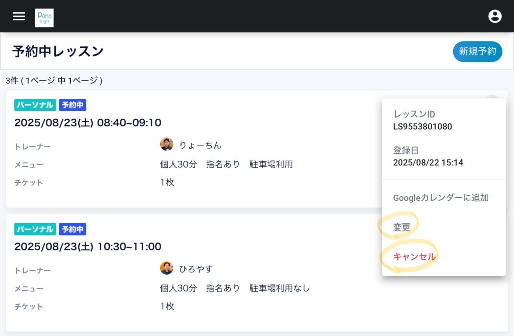 メニューから「予約」を選ぶと、現在予約中のレッスンが表示されます。