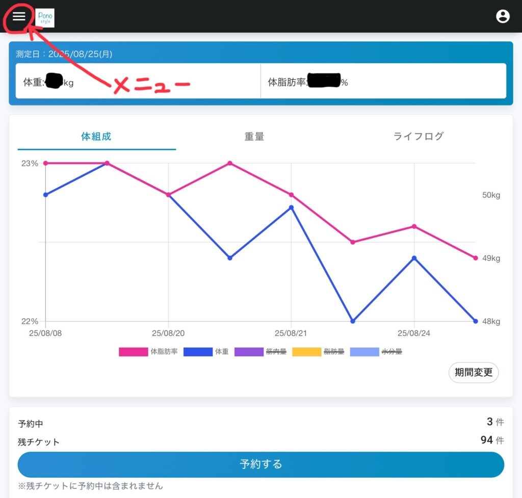 メニューから「予約」をタップし、予約中レッスンを表示します。