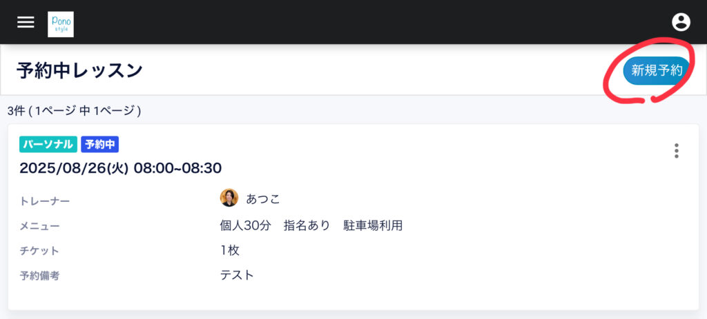 新規予約をする際は、右上のボタン「新規予約」をタップしてください。