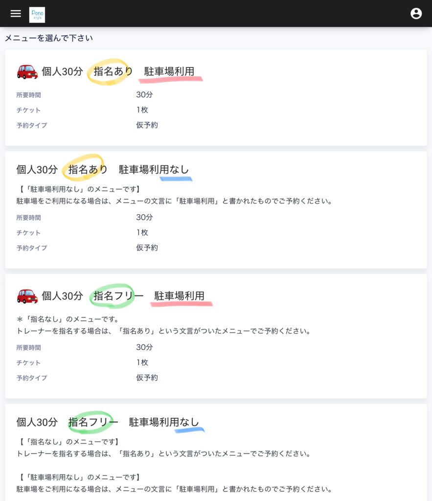 メニューは「指名あり・フリー」「駐車場利用・駐車場利用なし」の4区別があります。
