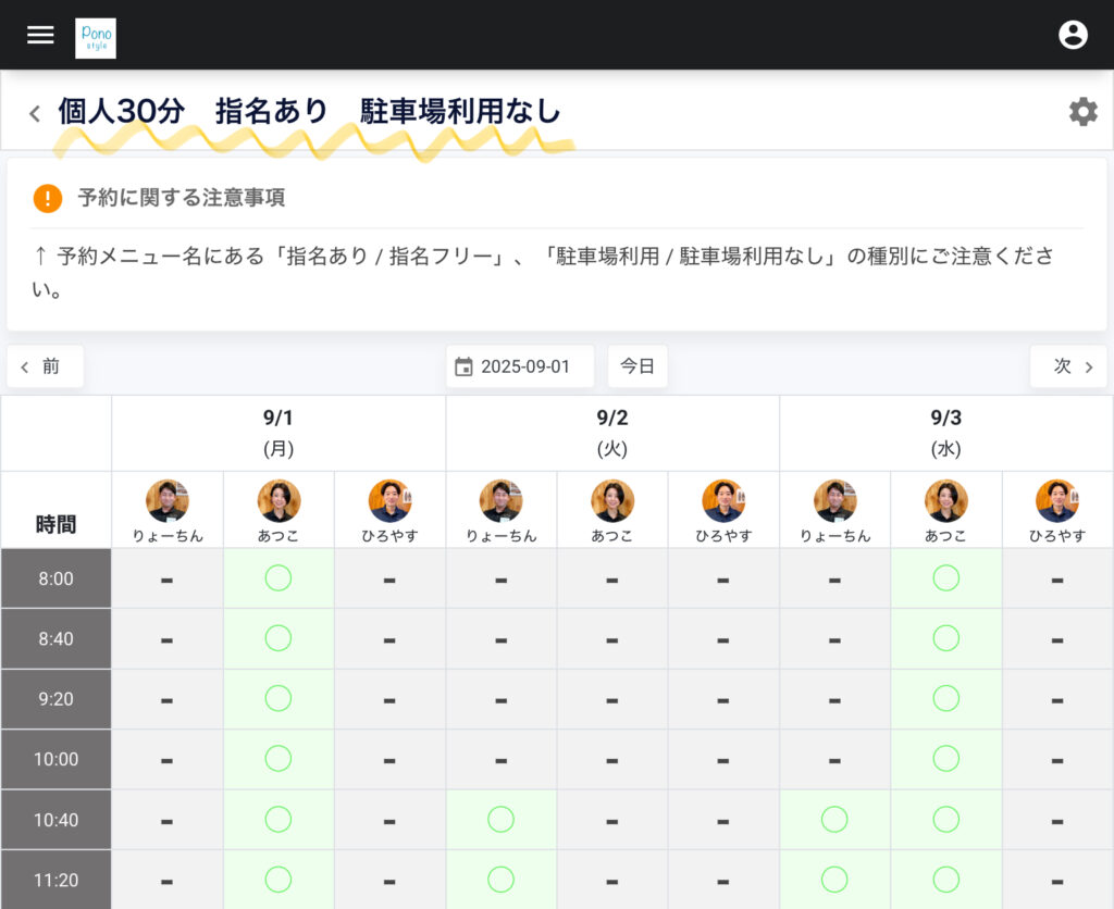 「指名あり」のメニューを選択すると、トレーナーごとの予約可能状況が表示されます。