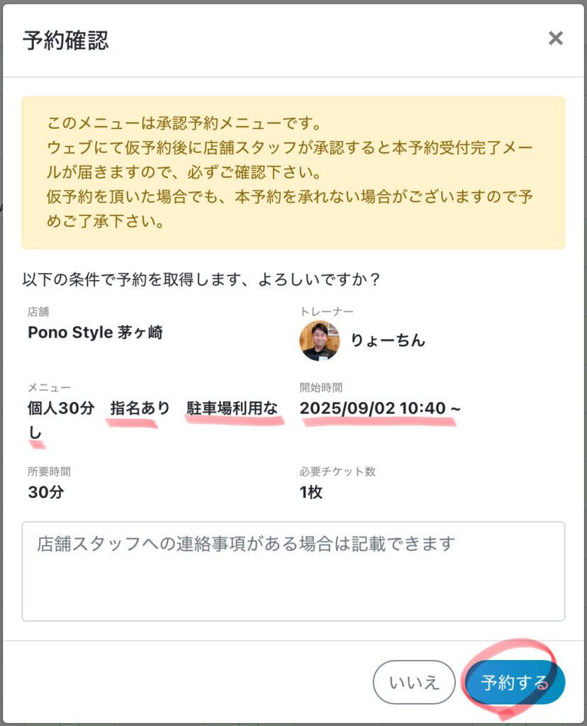 予約メニューの内容、時間をご確認の上、「予約する」をタップしてください。